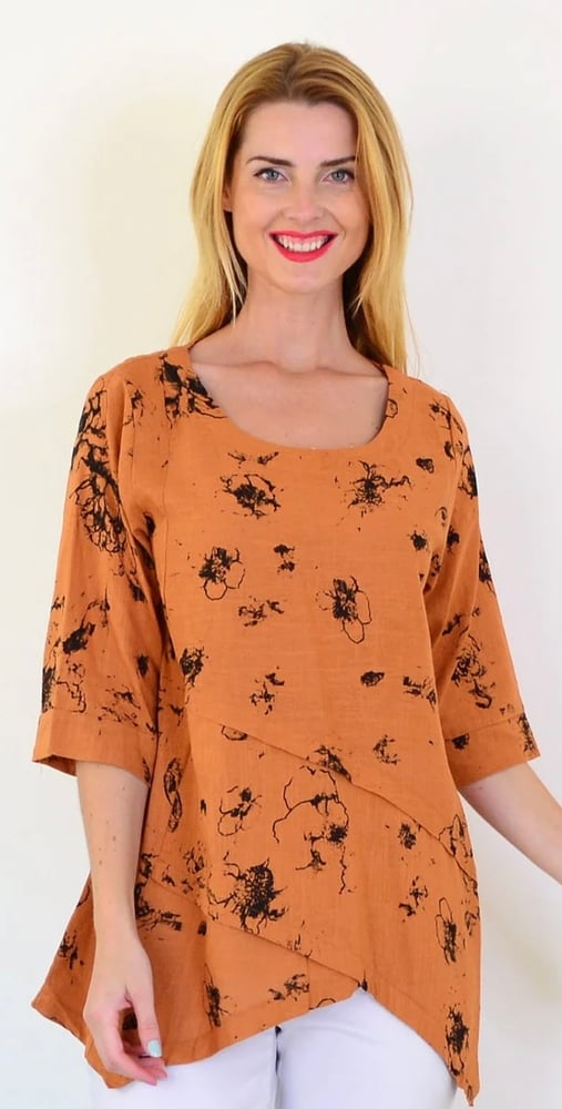 A flattering linen cotton top with a great shape that keeps you covered up but cool. With a three quarter sleeve and asymmetric hem, this flattering style has a modern look. Add a black or white pant and flat shoes or high for a funky outfit perfect for work or weekends!