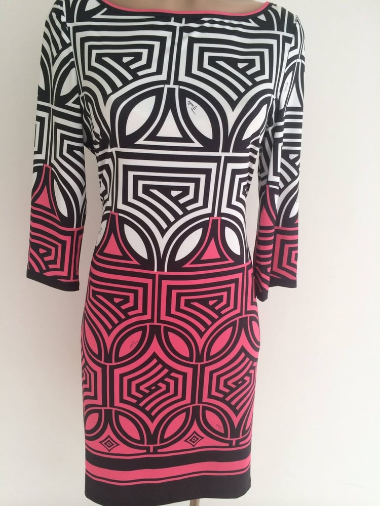 Great design with half dress white and bottom pink amazing black lined pattern with three quarter sleeve and dress is above the knee