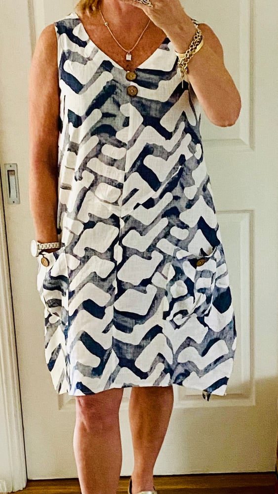 The shift style is flattering on all body types, simply slip it on and walk out the door in style. Made in a wave blue patterned linen fabric, this dress is the perfect way to wear the natural look trend.